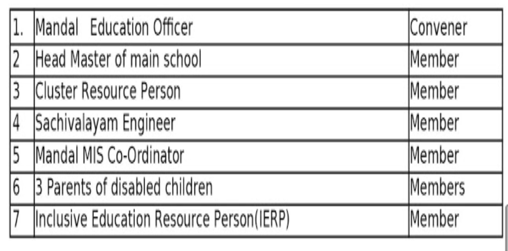 In addition to the SI.No 1-6 of the above committee and any two parents of the disabled children shall empower to sign on all the cheques and payments. The Inclusive Education (IE) Coordinator shall attend all the meetings as non signing member.